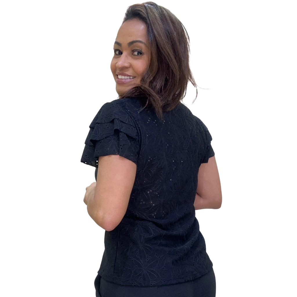 Delicada, feminina e cheia de charme, a Blusa Laise com Manga Babados é perfeita para quem ama peças com um toque romântico e atemporal. Confeccionada em laise, que é um tecido leve, fresco e com desenhos de bordados vazados; ela se destaca pelos babados nas mangas, que trazem movimento e elegância ao visual. Ideal para dias mais quentes, a blusa é versátil e combina facilmente com jeans, saias ou shorts, criando looks que vão do casual ao sofisticado com facilidade.