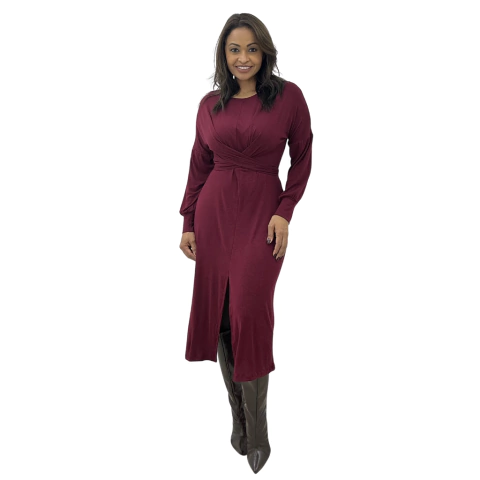 Vestido longuete manga longa com amarração e fenda frontal; sofisticação que valoriza seus movimentos. Confeccionada em tecido viscolycra, que é uma malha leve, tem ótimo caimento muito conforto e toque muito agradável; e se adapta perfeitamente ao corpo. Possui manga longa, punho ajustado, comprimento longuete, decote redondo alto, fendas frontal e detalhe de amarração na cintura parte frontal. Elegante na medida certa, é a peça perfeita para quem busca charme, conforto e um toque de ousadia equilibrada. Ele combina o comprimento clássico com detalhes modernos que realçam a silhueta de forma sutil e poderosa.